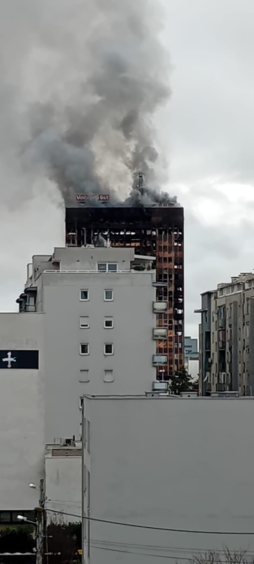 Zagreb: Veliki požar koji je sinoć zahvatio Vjesnikov toranj u Zagrebu i dalje nije potpuno ugašen. Jutro nakon dramatične noći, iz tornja se još uvek diže gust dim, dok vatrogasci sa više strana nastavljaju borbu sa preostalim žarištima.