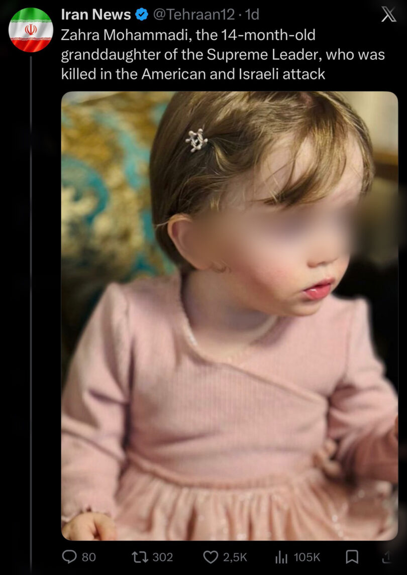 Objava koja se pojavila na društvenoj mreži X, sa naloga pod nazivom „Iran News“, izazvala je snažne reakcije javnosti nakon što je u njoj navedeno da je 14-mesečna Zahra Mohammadi, predstavljena kao unuka vrhovnog vođe Irana, ajatolaha Alija Hamneija, navodno stradala u američko-izraelskom napadu.